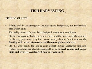 This document summarizes traditional fishing crafts and gear used in India. It describes the main types of crafts used on the east and west coasts of India, including catamarans, masula boats, dinghies, and built-up boats. It also outlines the major net types like seine nets, drift nets, trawl nets, and hook-and-line techniques like hand lines, pole-and-lines, and long lines. The document provides detailed descriptions of fishing methods and how specific gears are constructed and operated to catch different types of fish.