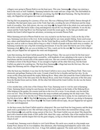 Samnang, a young Cambodian boy, encounters a giant Mekong catfish multiple times over the course of a year as it undertakes a long journey. The catfish travels from Tonle Sap Lake to Phnom Penh for boat races, then further north to Kampong Cham, Kratie, Stung Treng, and finally back to Tonle Sap Lake where it spawns with other fish during the rainy season, spreading its eggs and baby fish throughout Cambodia's waterways.