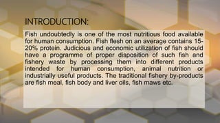 1. The document discusses the production of fish meal, which is a concentrated feed obtained by milling and drying fish flesh that is high in protein and minerals.