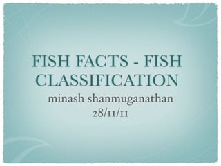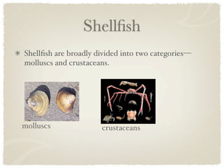 The document discusses the classification of different types of fish and shellfish. It divides shellfish into two main categories - molluscs and crustaceans. Molluscs include those with one shell like periwinkles, two shells like mussels, or no external shell like squid. Crustaceans have a hard segmented shell and joints, and include shrimp, crab and lobster. Finfish are divided into whitefish which have oils only in the liver, and oil-rich fish where oils are throughout the flesh, like salmon. Whitefish are further divided into round and flat varieties. Finfish can also be classified as demersal, living near the seabed, or pelagic swimming