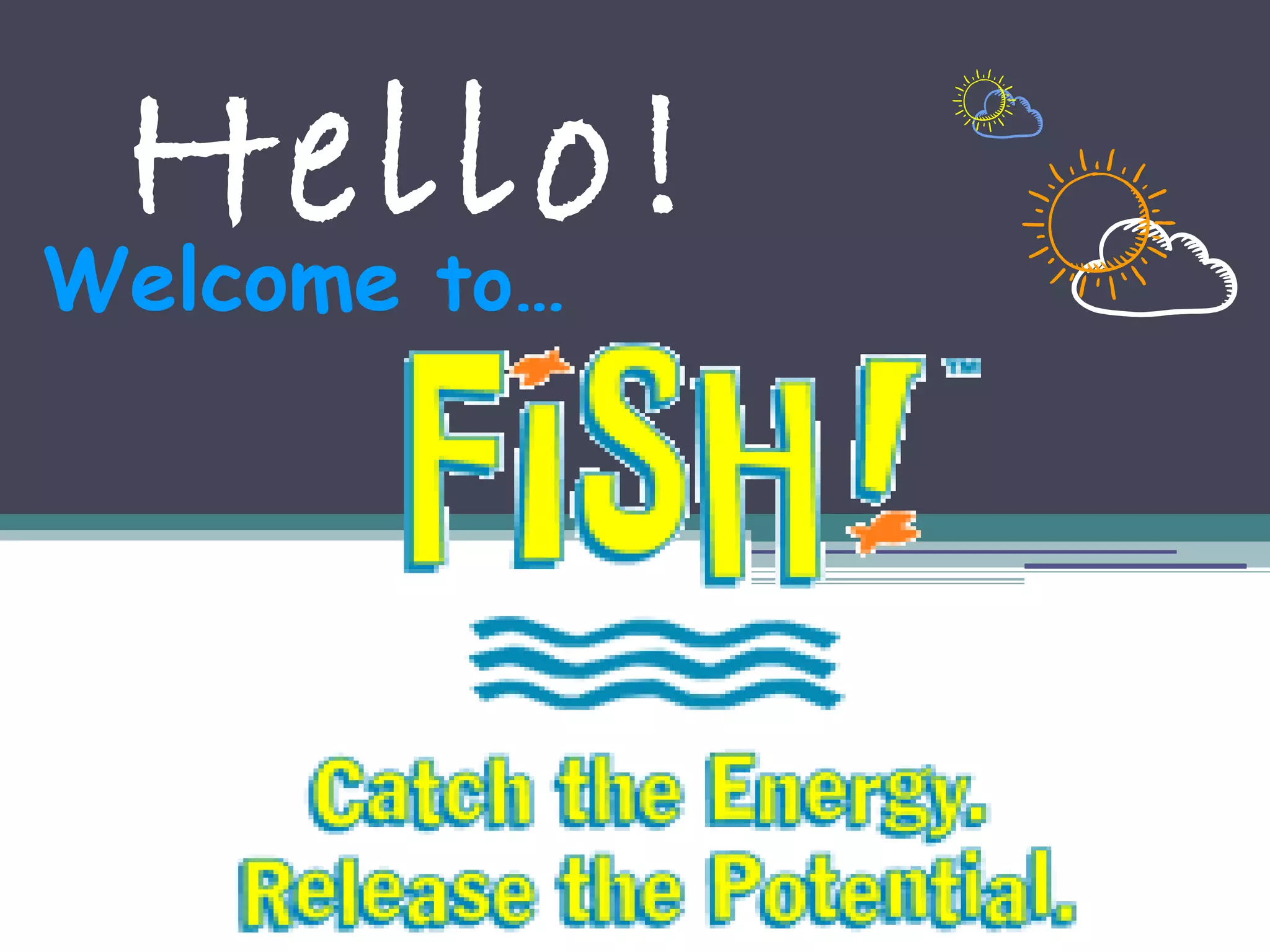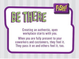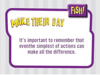 The document discusses the 'Fish!' philosophy, a motivational approach that emphasizes the importance of attitude, play, and making connections to boost workplace morale and productivity. It outlines four key practices to enhance energy and teamwork, encouraging individuals to choose their attitude, play, be present, and positively impact others' days. Ultimately, it emphasizes building meaning in one's work and fostering a supportive environment.
