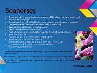 The document provides information about seahorses in 14 bullet points, describing their appearance, behaviors, sizes, and other characteristics. It notes that male seahorses carry babies in pouches and that they range from 1/2 inch miniature pygmy seahorses to 14 inch long potbelly seahorses. It also states that seahorses have no stomach or teeth and that their small fins can flutter rapidly.
