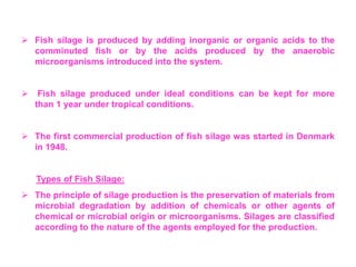 Fish silage is produced by preserving fish or fish waste through the addition of acids or lactic acid bacteria. There are two main types: acid silage produced through the addition of inorganic or organic acids like sulfuric acid or formic acid; and biological silage produced through lactic acid fermentation by bacteria like Lactobacillus plantarum. The fish material is minced and acids or bacteria added, then stored to produce the silage. The acids or lactic acid lower the pH and inhibit spoilage during storage. Fish silage can be stored for over a year and used as animal feed.