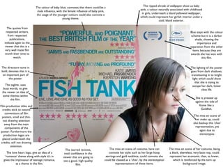 The document discusses the symbolism and themes that can be inferred from various elements of a movie poster. It analyzes how colors, costumes, lighting, mise-en-scene, reviews, and other components provide clues about the film's possible themes of escaping a lower class life, teenage romance, and portrayals of stereotypes.