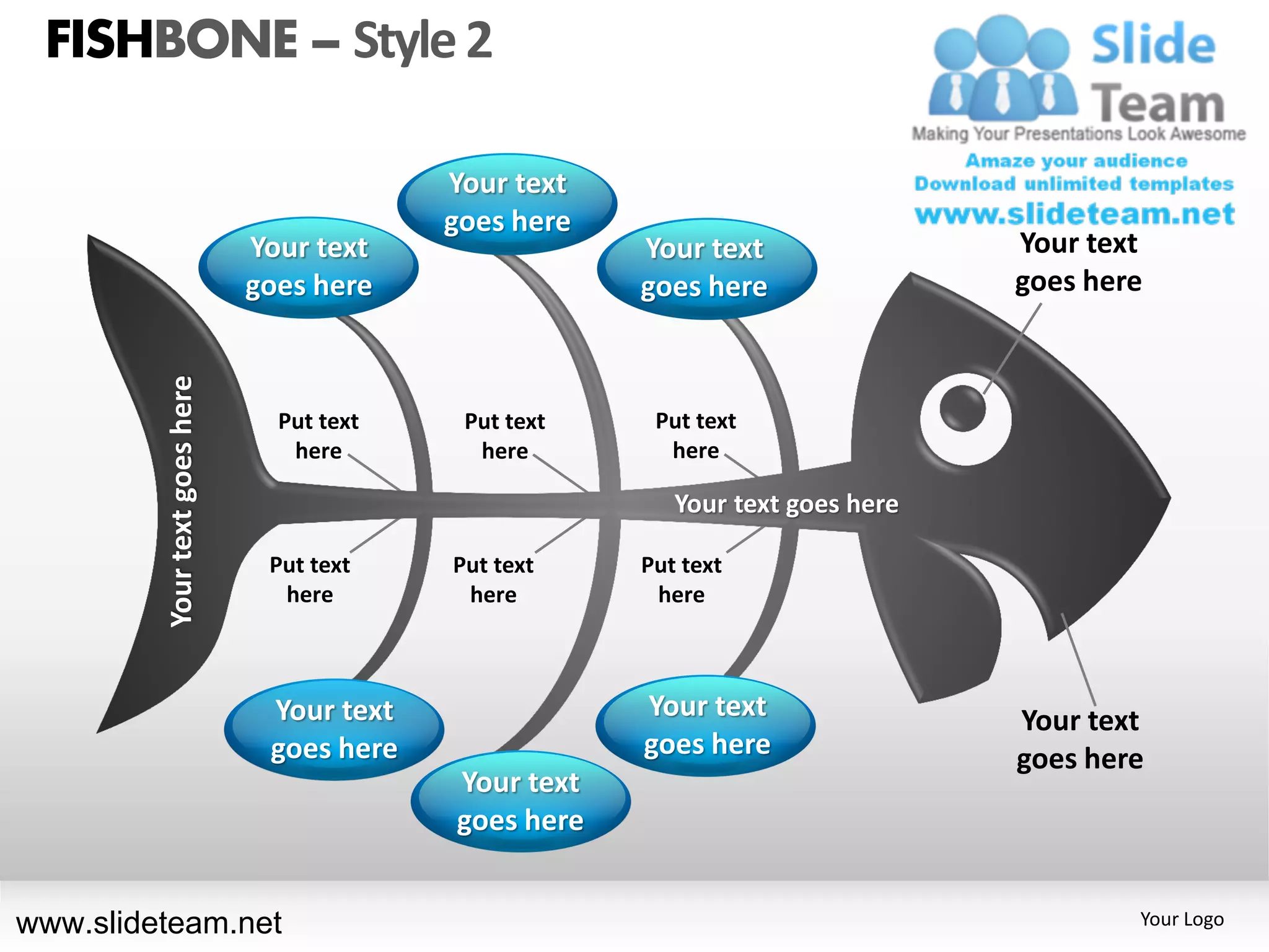 The document shows different styles of fishbone diagrams that can be used in PowerPoint presentations. The fishbone diagrams have branches extending from a central topic to various causes or factors. Placeholder text or examples are included throughout the diagrams. Instructions are provided at the bottom on how to individually edit objects by ungrouping them and changing features like color, size or orientation. The diagrams provide templates that can be customized for root cause analysis or other topics.
