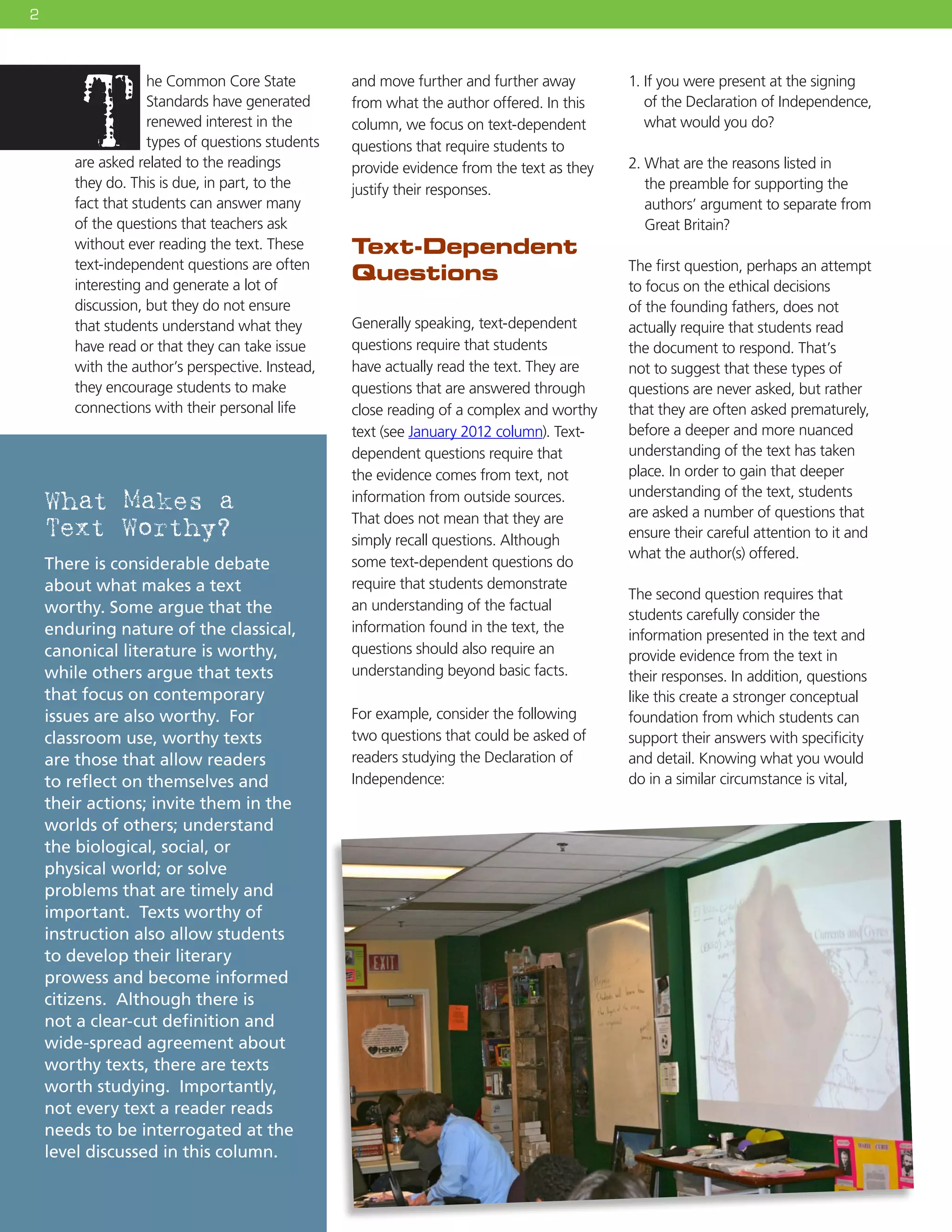 The document discusses text-dependent questions that require students to provide evidence from the text to justify their responses. It explains that text-dependent questions ensure students have carefully read and understood the text, rather than answering questions without reading. The document provides examples of different types of text-dependent questions teachers can ask, from general understanding questions to questions about key details, inferences, and opinions. It also gives an example of text-dependent questions a teacher asked about the poem "Jabberwocky".