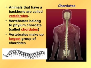 This document discusses chordates and vertebrates. It notes that vertebrates have backbones and belong to the phylum chordata. It also describes two other chordate groups, lancelets and tunicates. Key characteristics of chordates include having a tail, nerve cord, pharyngeal pouches and notochord. The document then focuses on characteristics of vertebrates like their backbone and skull. It classifies vertebrates as either warm-blooded or cold-blooded. Finally, it outlines the three classes of fish and characteristics like breathing with gills and reproduction through external fertilization.