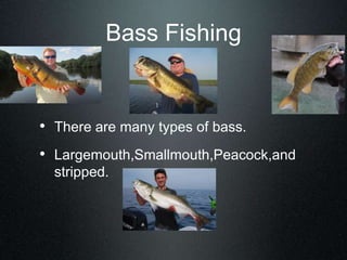 This document discusses different types of bass fishing including largemouth, smallmouth, peacock and stripped bass. It also outlines some popular bass fishing lures such as crankbaits which come in various sizes, shapes and colors and plastic worms which have many options. Finally, it mentions that fishing poles suitable for certain fish types are available in many varieties.