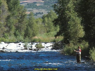 This document contains a list of fishing locations and experiences in various states and countries including California, Utah, Alaska, Montana, New Zealand, Colorado, Idaho, Wyoming, Maine, Oregon, and Washington. Some of the specific locations mentioned include Steelhead Fishing on the Sacramento River in California, fishing on the Provo River in Utah, a bush camp in Alaska, Armstrong Spring Creek in Montana, and the Big Wood River in Idaho.
