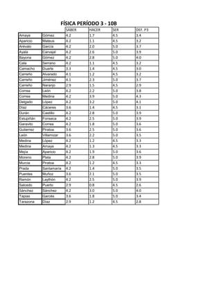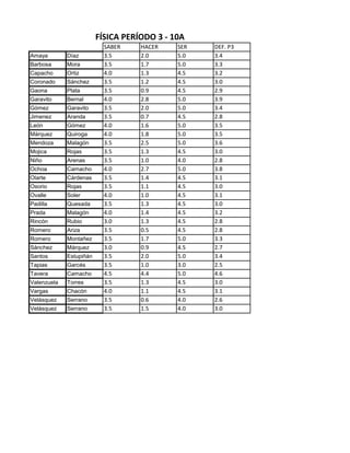 The document lists the names of students in a Physics class for period 3 along with their scores on dimensions of saber (knowing), hacer (doing), ser (being) and their final grade average for the period. There are two sections, 10A and 10B, with approximately 30 students listed in each along with their scores which range from 2.5 to 4.6.
