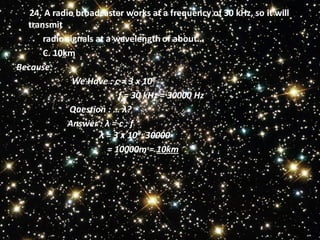This document contains details about an Islamic senior high school student group including the names of group members and 25 multiple choice questions about electromagnetic waves and the electromagnetic spectrum. The questions cover topics like the scientist who developed electromagnetic theory, properties of electromagnetic waves, order of different parts of the electromagnetic spectrum by frequency and wavelength, uses of different parts of the spectrum, and calculations involving wavelength, frequency and speed of electromagnetic waves.