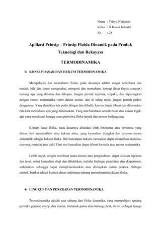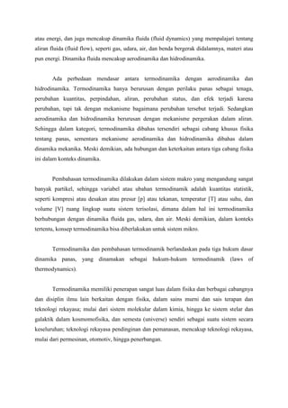 Dokumen ini membahas aplikasi prinsip-prinsip fluida dinamik dan konsep dasar termodinamika, termasuk hukum-hukum dasar yang mengatur perilaku energi dan materi. Termodinamika berfokus pada perubahan energi dan perpindahan panas dalam sistem, sementara aerodinamika dan hidrodinamika membahas mekanisme pergerakan dalam fluida. Selain itu, pengantar tentang entropi dan hukum termodinamik menunjukkan keterkaitan ilmu fisika dengan teknologi dan aplikasi rekayasa.