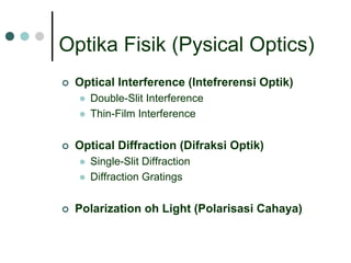 2) Thin-film interference caused by light reflecting off the top and bottom surfaces of a thin film, which can produce colorful interference patterns.