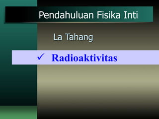 Dokumen ini membahas tentang fisika inti, fokus pada fenomena radioaktivitas dan proses peluruhan yang terjadi pada inti atom. Berbagai jenis radiasi yaitu alpha, beta, dan gamma dijelaskan, beserta konsep stabilitas nuklida dan hukum peluruhan eksponensial. Kontanta peluruhan, aktivitas radioaktif, serta teori statistik terkait peluruhan atom juga diperkenalkan.