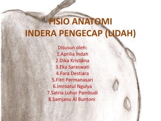 Dokumen ini membahas anatomi dan fungsi indera pengecap pada lidah, termasuk bagian-bagian lidah serta berbagai jenis papila dan kuncup pengecap yang berperan dalam merasakan rasa makanan. Lidah mengandung sel reseptor yang bekerja dengan saraf untuk mengirimkan sinyal rasa ke otak, memungkinkan kita untuk mengecap makanan dan minuman. Selain itu, terdapat penjelasan tentang zat-zat kimia yang menimbulkan sensasi rasa yang berbeda.