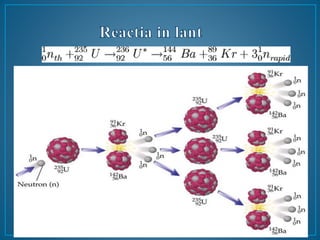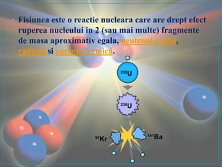Fisiunea nucleară este o reacție prin care nucleul unui atom greu se rupe, eliberând energie, neutroni rapizi și radiații. Aceasta este utilizată în centralele nucleare pentru producerea de energie și în fabricarea armelor nucleare, unde neutronii inițiază reacțiile în lanț. Reactoarele nucleare controlează acest proces pentru a genera energie, fiind construite inițial de Enrico Fermi în 1942.