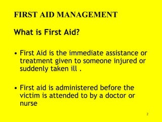 First aid is immediate assistance given to someone who is injured or ill. The aims of first aid are to preserve life, limit worsening of the situation, and promote recovery. Workplaces must have first aid facilities that are stocked according to legal standards and have trained first-aiders available during working hours. Responsibilities of first-aiders include assessing situations quickly, summoning help, giving early treatment, and arranging for further care. Proper first aid procedures should be followed for injuries like bleeding wounds, fractures, burns, eye injuries, and electric shock.