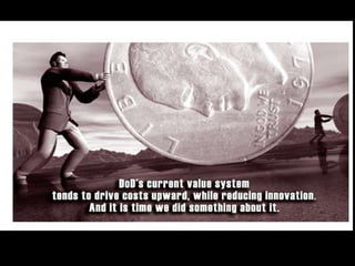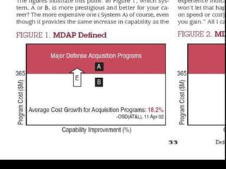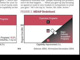 The document summarizes findings from a 2008 GAO report on major US weapon programs. It finds that outcomes have not improved over 6 years and programs routinely cost more, take longer, and deliver less than promised. It also discusses how long development cycles are a major problem, with the average program taking over 8 years compared to 5 years planned by the DoD. Shorter development times are seen as key to successful programs.