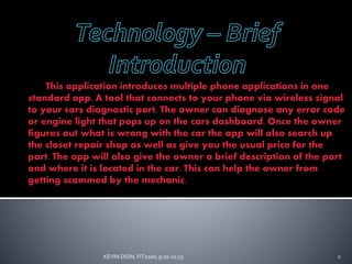 This application allows users to diagnose error codes, find recommended local repair shops and estimates, and get descriptions of car parts from their phone. The app connects wirelessly to a car's diagnostic port to access vehicle data and systems. It also provides basic car maintenance notifications and allows users to track fuel efficiency and mileage.