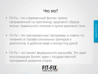 Fit-fix — это онлайн-сервис для фитнеса и бодибилдинга, предлагающий индивидуальные тренировочные программы и советы по питанию от профессионалов. Проект нацелен на стимуляцию здорового образа жизни и развитие спорта, с планами расширения и внедрения новых функций в будущем. Услуга имеет высокий уровень удержания пользователей и успешные показатели в области маркетинга.