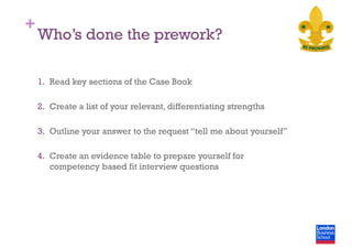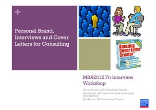 This document provides guidance for an MBA interview workshop focused on consulting. It discusses developing a personal brand, preparing for fit and competency interviews, and crafting cover letters. Key points include developing a concise personal brand statement, preparing evidence-based examples to demonstrate competencies, and tailoring responses and cover letters to reflect the individual's brand and motivations for pursuing consulting.