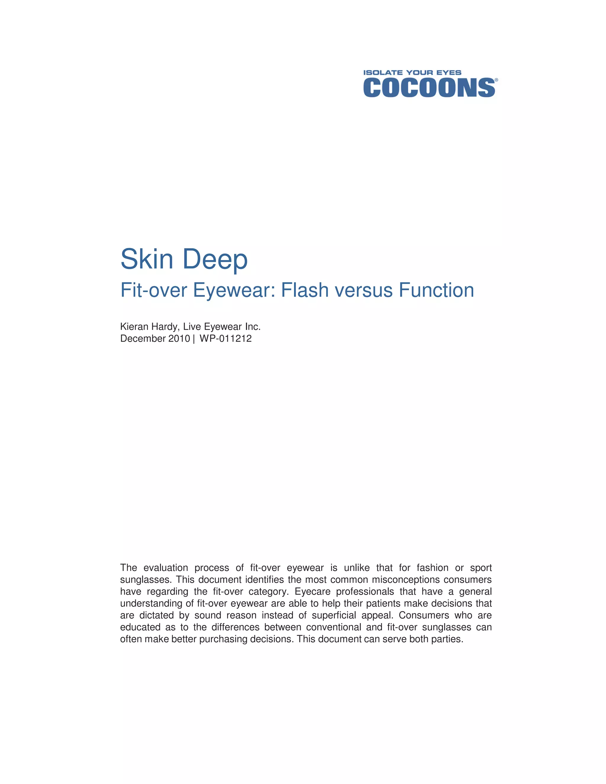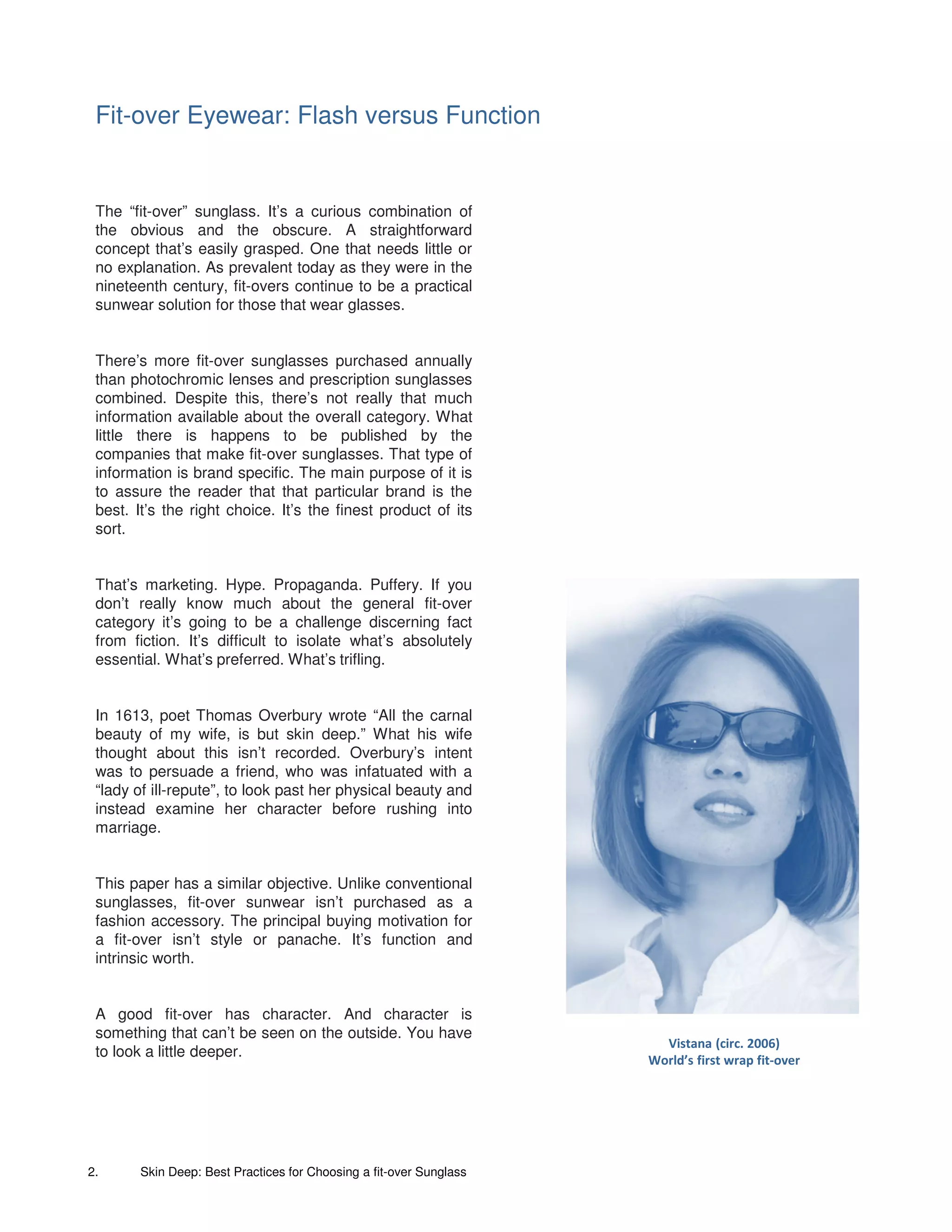 This document provides an overview of important considerations for choosing a fit-over sunglass. It discusses how fit-over eyewear is different from conventional sunglasses in that function is prioritized over fashion. The frame material and design are essential, with malleability and an undercarriage being key characteristics. A soft, flexible material is important for comfort of the "ride" when worn over prescription glasses. The document aims to educate consumers and eyecare professionals on evaluating fit-over sunglasses based on performance characteristics rather than superficial attributes.