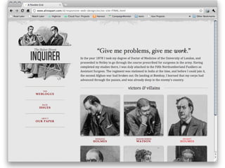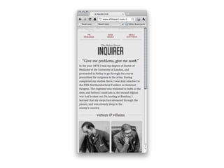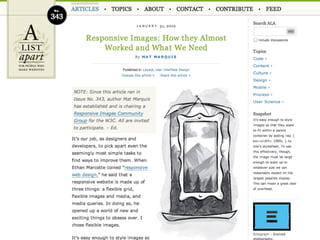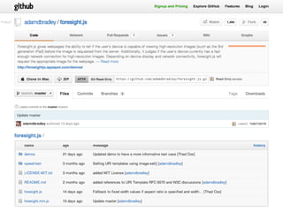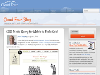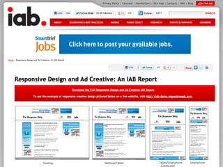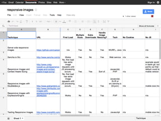 The document summarizes key techniques for responsible responsive web design, including building mobile-first responsive designs, keeping CSS images in their place, conditionally loading JavaScript based on screen size and capabilities, delivering different sized images at different screen sizes, and handling high-density images carefully. It also discusses debates around whether a one-size-fits-all responsive approach can compete with a tailored experience and ensuring responsive designs are optimized for performance.