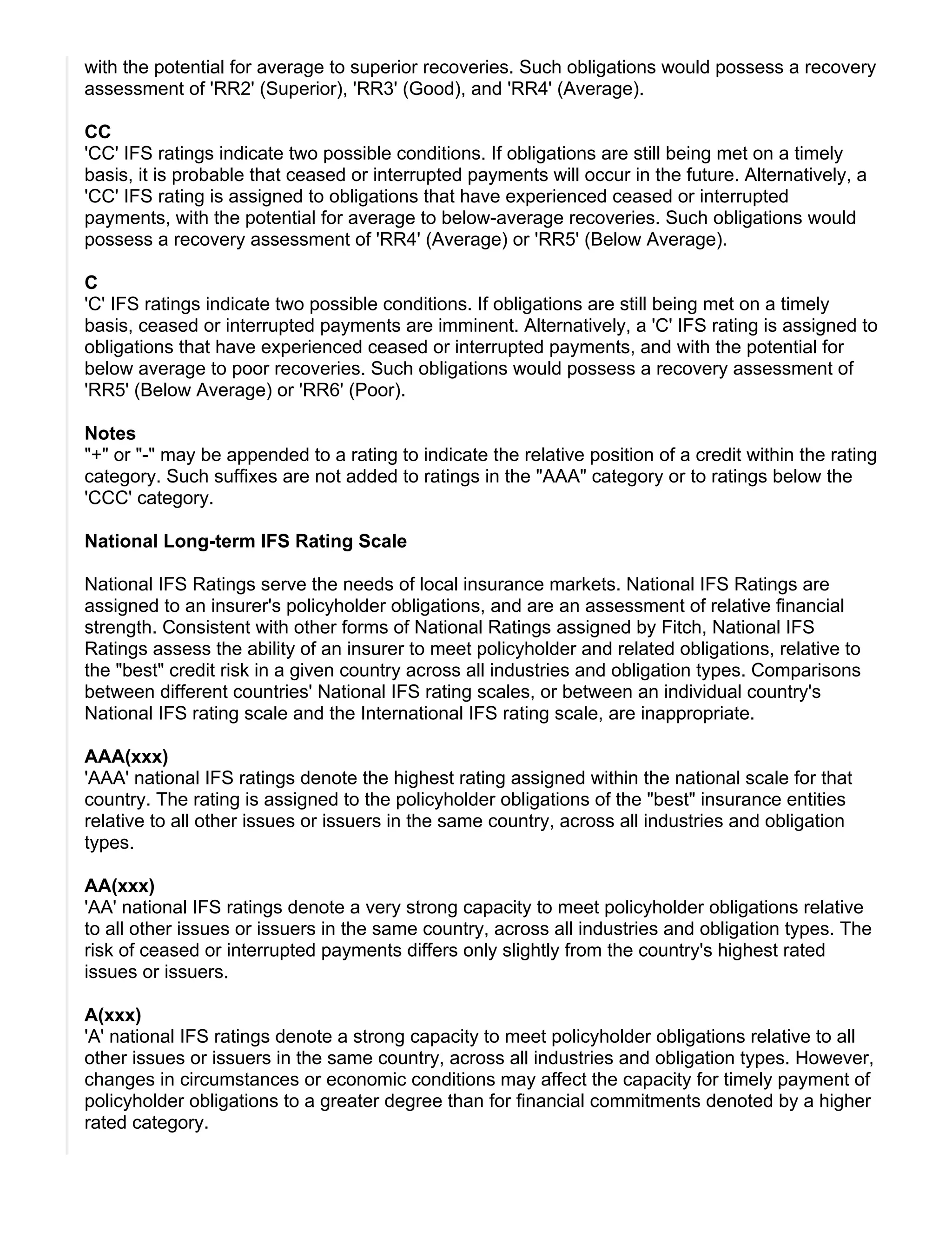 The document provides definitions for Fitch Ratings scales that assess the financial strength and obligations of insurance companies. The scales rate insurance companies from AAA to C based on their capacity and vulnerability to meet policyholder and contract obligations. Higher ratings of AAA to BBB are considered secure while lower ratings of BB and below are considered vulnerable. Short-term ratings from F1 to C also assess the intrinsic liquidity and timely payment of short-term obligations.