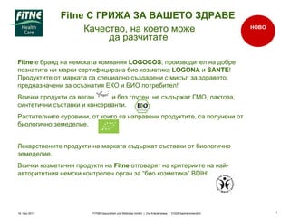 19. Dez 2011FITNE Gesundheit und Wellness GmbH | Zur Kräuterwiese | 31020 Salzhemmendorf Качество, на което може да разчитате Fitne е бранд на немската компания LOGOCOS , производител на добре познатите ни марки сертифицирана био козметика LOGONA и SANTE ! Продуктите от марката са специално създадени с мисъл за здравето, предназначени за осъзнатия ЕКО и БИО потребител! Всички продукти са веган и без глутен, не съдържат ГМО, лактоза, синтетични съставки и консерванти. Растителните суровини, от които са направени продуктите, са получени от биологично земеделие. . Лекарствените продукти на марката съдържат съставки от биологично земеделие. Всички козметични продукти на Fitne отговарят на критериите на най-авторитетния немски контролен орган за “био козметика” BDIH! Fitne С ГРИЖА ЗА ВАШЕТО ЗДРАВЕ НОВО