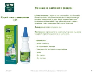 19. Dez 2011FITNE Gesundheit und Wellness GmbH | Zur Kräuterwiese | 31020 Salzhemmendorf Кратко описание: Спреят за нос с минерална сол почиства носната кухина и предпазва лигавицата от изсушаване при настинки и запушване на носа. Може да използвате при наличие на ниска влажност при продължително стоене в затворени стаи и помещения. Без глутен и лактоза. Съдържание: вода, натурална сол Приложение: впръсквайте по няколко пъти дневно във всяка ноздра от спрея според силата на настинката. Предимства: нежен към носа не предизвиква алергии 6 месеца срок на годност след отваряне веган без глутен без лактоза Спрей за нос с минерална сол Лечение на настинки и алергии