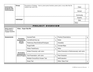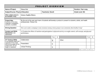The project involves students developing a campaign to raise awareness in the community about healthy living and presenting their findings at a Fitness Fair. Over the course of a year, student teams will research how nutrition, physical activity, and other lifestyle factors affect health. They will address content standards on these topics and practice collaboration, critical thinking, and presentation skills. Students will be assessed through tests, presentations, peer and self-evaluations, and a final class exam. The teacher will provide lessons on campaign development, health topics, and presentation skills to support students' work.
