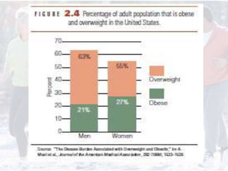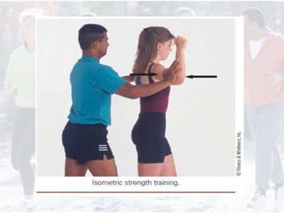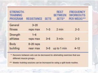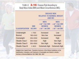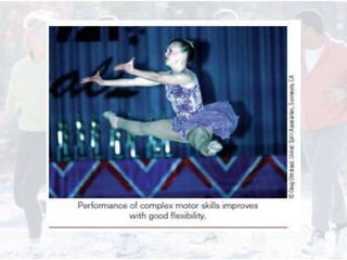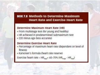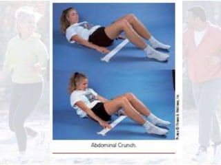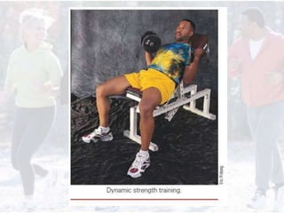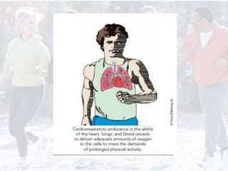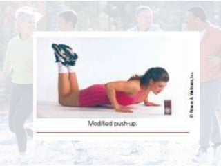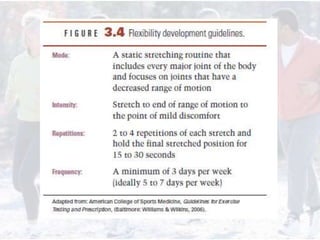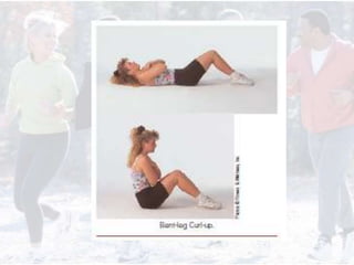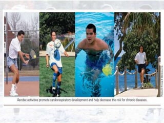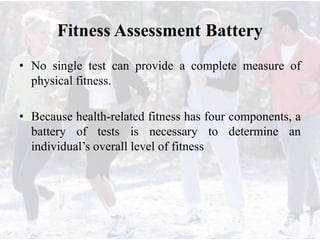 This document provides information on assessing different components of physical fitness, including cardiorespiratory endurance, muscular strength and endurance, flexibility, and body composition. It describes several tests to evaluate each component, such as the 1.5-mile run test for cardiorespiratory endurance, the bench jump, modified dip/push-up, and bent-leg curl-up tests for muscular strength and endurance, the sit-and-reach and total body rotation tests for flexibility, and methods like skinfold thickness measurements, bioelectrical impedance, and hydrostatic weighing to determine body composition. Maintaining an appropriate level of fitness in each area is important for health.