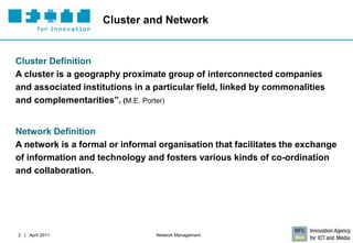 The document discusses the importance of network and cluster management in fostering economic growth through collaboration and knowledge transfer among interconnected companies and institutions. It highlights the need for professional management tools and monitoring efforts, presenting various tools like scorecards and collaborative platforms designed to evaluate and improve cluster initiatives. Additionally, it includes a framework for cluster management that emphasizes strategy, assessment, and the sharing of best practices among managers.