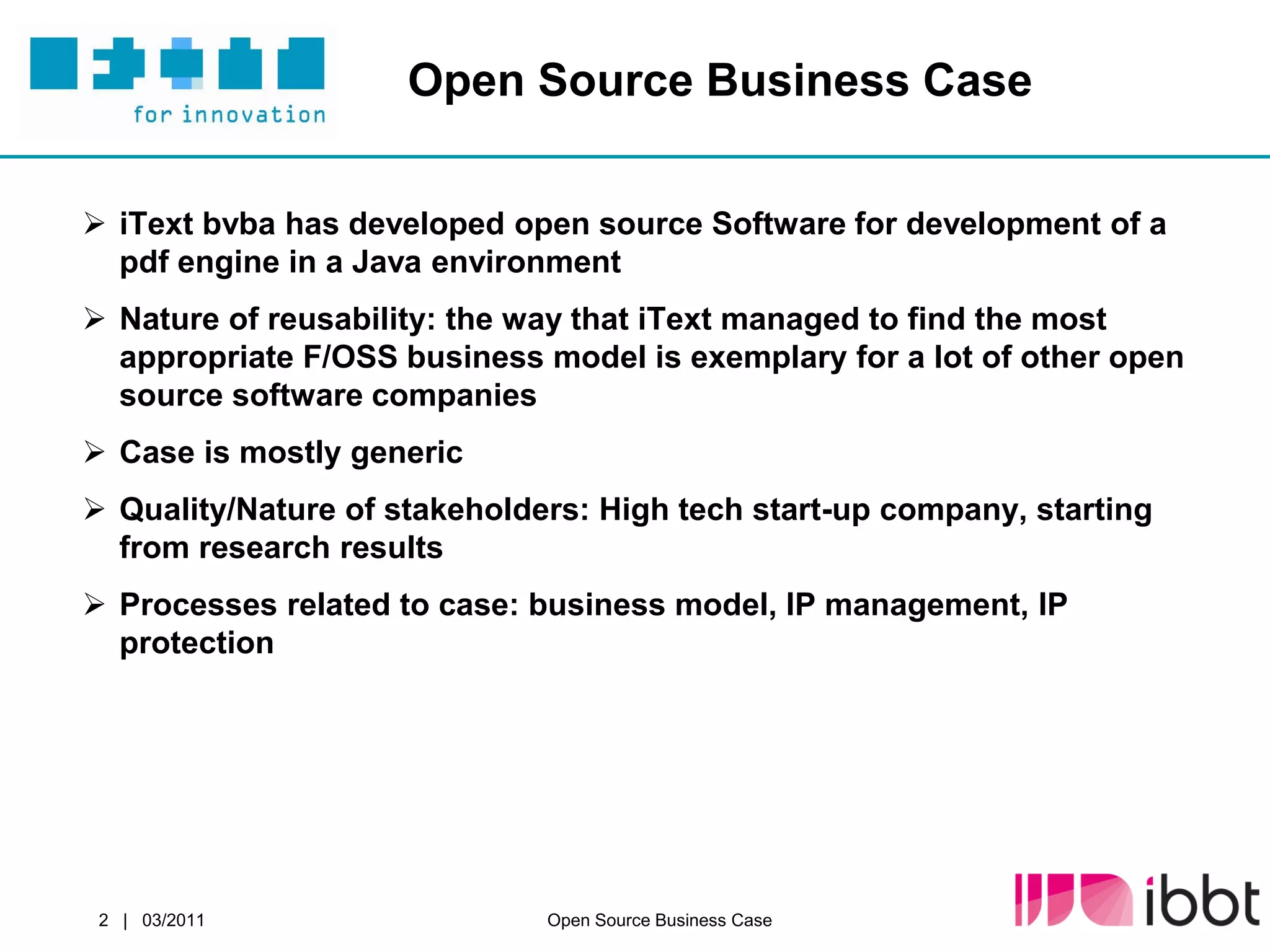 The document discusses the open-source business case of itext bvba, a company that developed a Java-based PDF library, highlighting its exemplary reusability and business model. It goes into detail about intellectual property (IP) management, including the various legal conditions surrounding free and open-source software licenses and the need for dual licensing to balance free distribution with custom paid options. The case study illustrates the importance of maintaining clear documentation and agreements regarding code contributions to prevent IP issues.