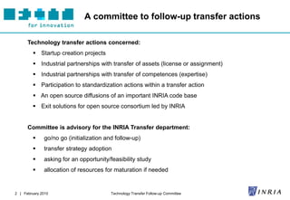 The Technology Transfer Follow-Up Committee (TTFUC) was established to oversee technology transfer actions including startup creation and industrial partnerships, with meetings held bi-monthly to assess projects. The committee consists of Inria members and private sector experts who provide strategic advice and ensure professionalization of stakeholders in the transfer process. Despite early resistance, the initiative has resulted in increased project submissions and valuable recommendations for improving transfer strategies.
