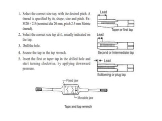 The document outlines various operations and tools used in fitting shops, including hand operations such as marking, sawing, and drilling, as well as work holding devices like bench vices and v-blocks. It also details measuring and marking tools, cutting tools such as hacksaws and files, and striking tools like hammers and chisels. Additionally, it describes the fitting job procedure for working with mild steel materials, emphasizing the importance of precision and proper measurement in the fitting process.