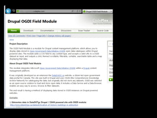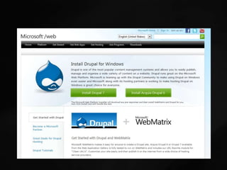 The document discusses the abundance of open source projects and plugins available for various Microsoft server products and emphasizes opportunities in cloud computing and open data. Key highlights include initiatives for government transparency and collaboration, as well as resources for utilizing platforms like Windows Azure and Drupal. The document also provides links to additional resources and case studies of open data projects using Microsoft technologies.