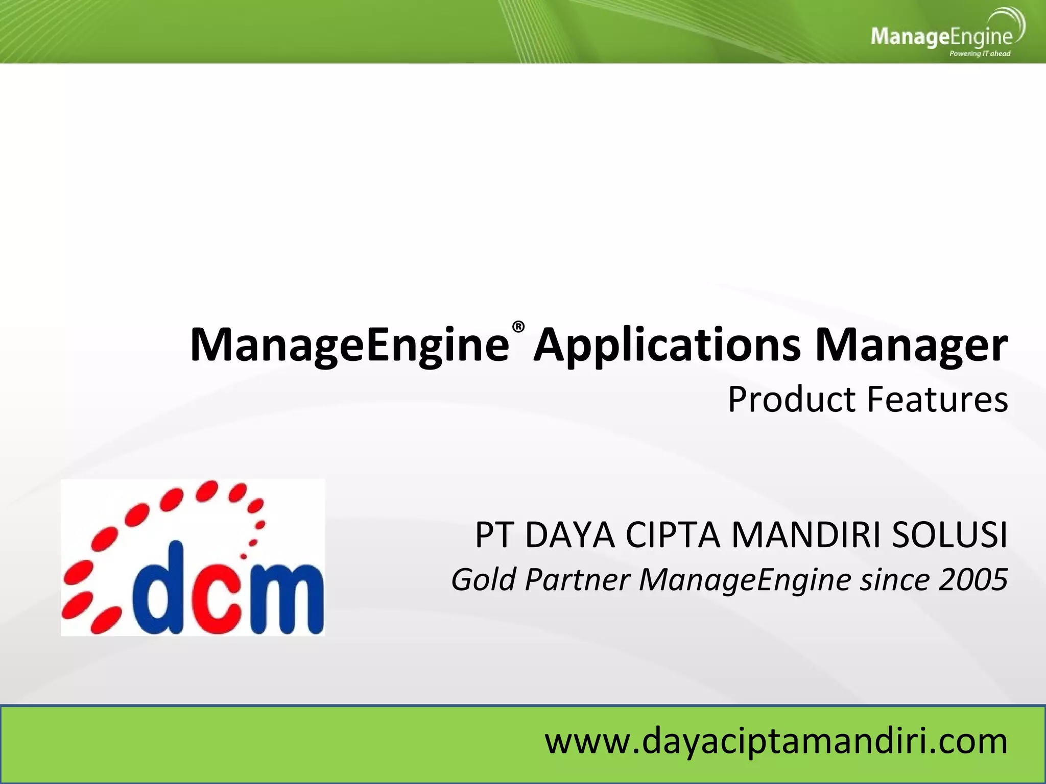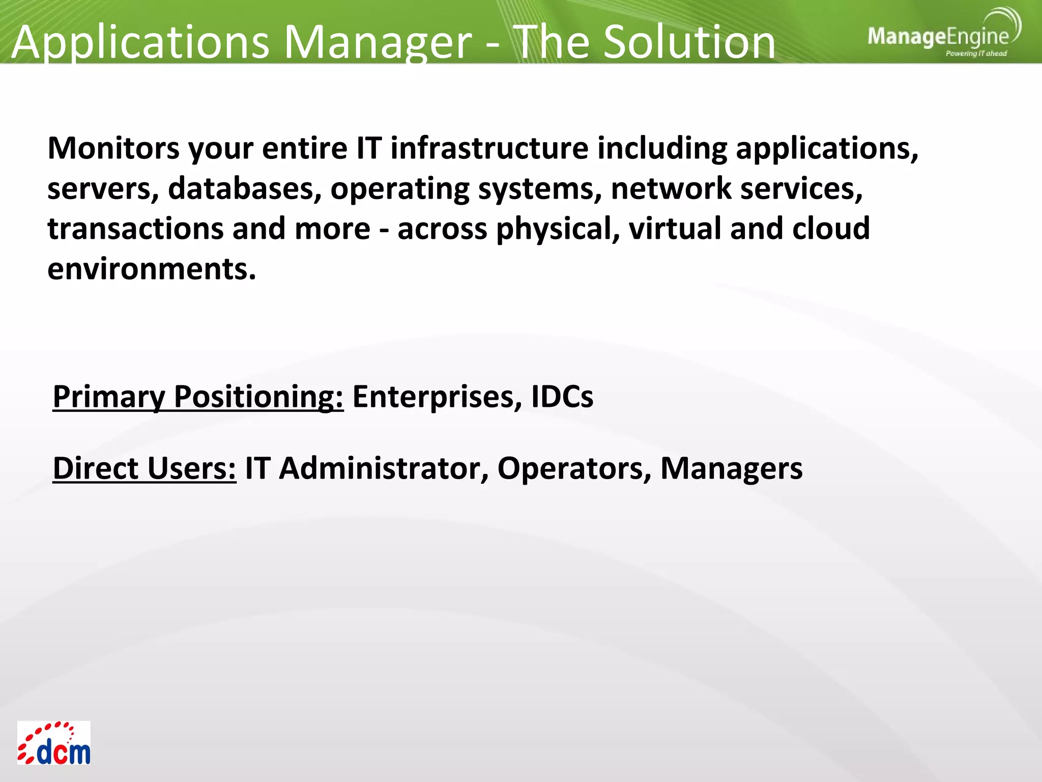 ManageEngine Applications Manager is a solution that monitors IT infrastructure including applications, servers, databases, operating systems, and network services across physical, virtual, and cloud environments. It provides unified monitoring of business infrastructure and diverse applications. Key functions include agentless monitoring of heterogeneous infrastructure, alerts and root cause analysis, reporting, and support for ITIL processes like SLA management. It is available in various product editions for small/medium/enterprise users.