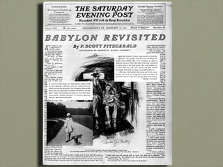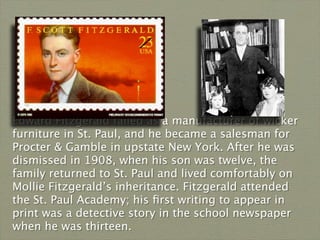 This document provides a biography of author F. Scott Fitzgerald. It details that he was born in 1896 in Minnesota and attended Princeton University, though he did not graduate. He published his first novel This Side of Paradise in 1920 which brought him fame. He married Zelda Sayre in 1920. The document outlines Fitzgerald's writing career and struggles with alcoholism. It also discusses his wife Zelda's mental health issues. Fitzgerald worked as a script writer later in life and was working on a new novel when he died in 1940.