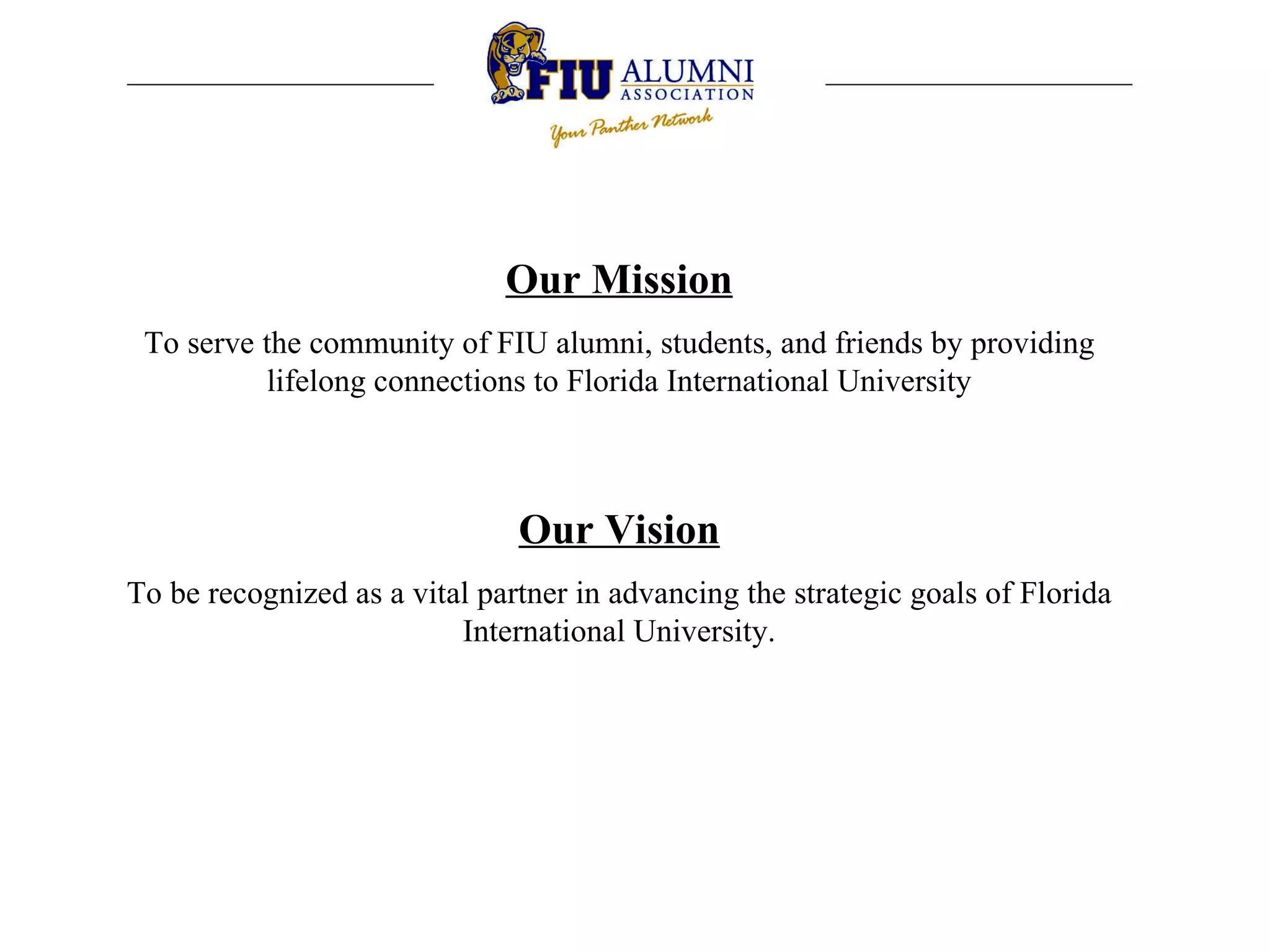 The Office of Alumni Relations at Florida International University aims to serve its alumni, students, and friends by fostering lifelong connections and advancing the university's goals. It focuses on membership growth, student support, diversity, leadership development, community involvement, and financial stability while organizing various events and programs to engage alumni. The association also promotes alumni participation in university initiatives and recognizes their contributions through awards and benefits.