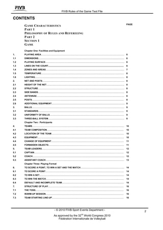 The document outlines the rules regarding facilities and equipment for volleyball. It specifies the dimensions of the playing area including the court size of 18x9m and free zone of minimum 3m width. It describes the lines marking the court including boundary lines and center line. It also defines the zones of the court including the front zone, service zone, and substitution zone. Equipment such as the net and posts are also specified.