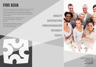 Five Asia is a boutique search firm that specializes in legal, IT & technology, finance, and human resources recruiting in Asia Pacific. They aim to become the most trusted talent provider through high quality service, outstanding results, and market-leading urgency. Five Asia prides itself on acting with the utmost professionalism, honesty, discretion, quality, satisfaction, and professionalism to be the partner of choice for leading organizations.