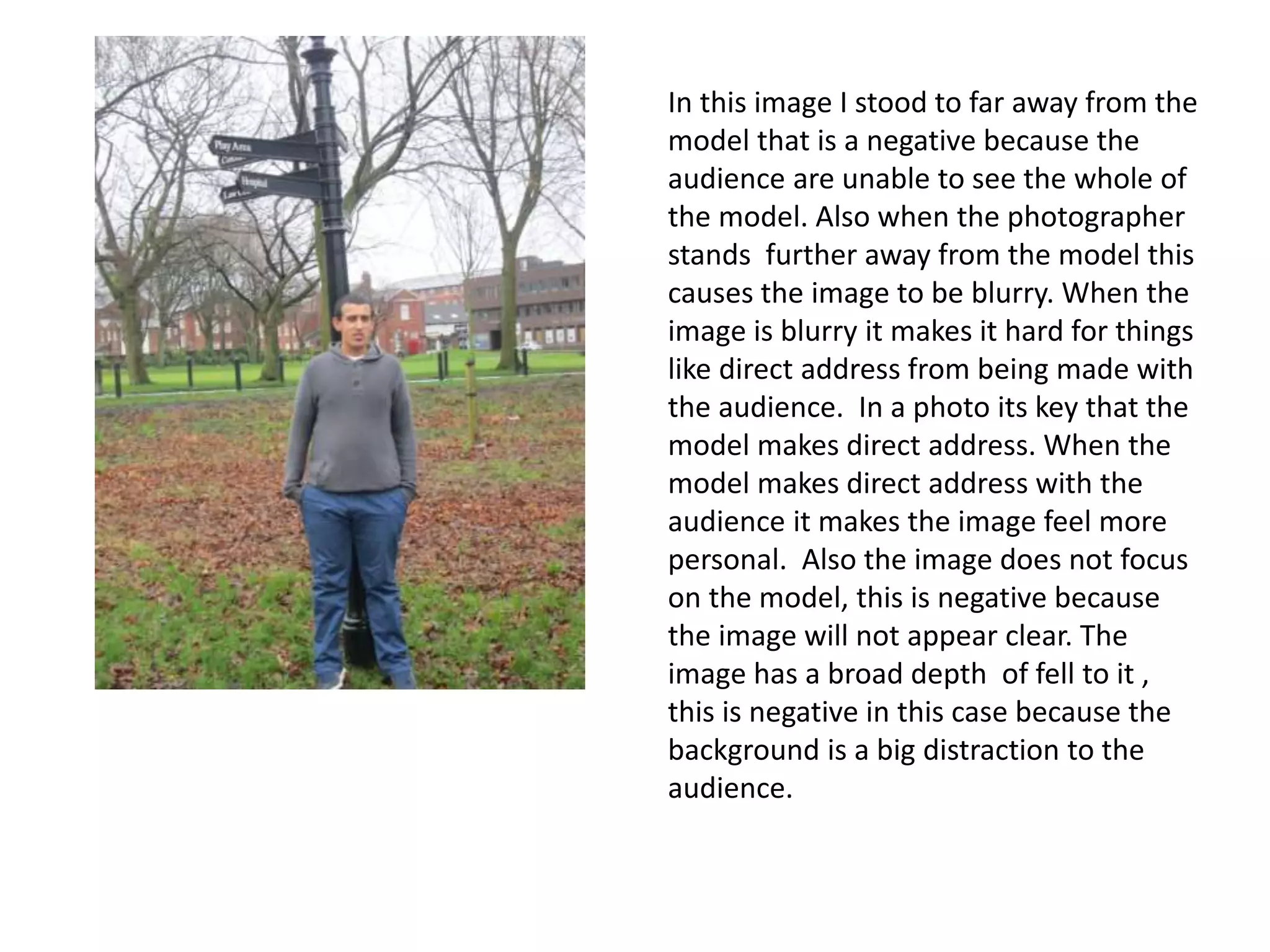 The document discusses several photographs taken for a magazine cover and evaluates them based on compositional elements. It provides analysis for each photo, identifying positives like the model making direct eye contact with the audience, clear lighting that illuminates the face, and a narrow depth of field focused only on the model. Negatives discussed include being too far from the model resulting in a blurry photo, lack of eye contact from the model, and distracting backgrounds. The best photo is said to have the model looking directly at the audience, clear lighting, no shadows, and the photographer close enough to capture good color and composition.