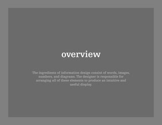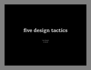 The document outlines five design tactics by Jon Freach for effective information design, focusing on the arrangement of words, images, numbers, and diagrams. These tactics include critically evaluating data, reducing redundancy, ordering content, designing with implicit grids, and separating color and weight to enhance clarity and hierarchy. The aim is to create intuitive and useful displays that effectively communicate ideas.