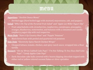 This document provides a menu and recipes for a Dance Moms themed dinner party. The menu includes fruit salad kabobs, deviled eggs, spicy ranch chicken wraps, ham and potatoes, and dark chocolate cake pops. It also includes time management plans, shopping lists, ingredient lists and directions for each recipe. The document discusses the creative cooking class experience, including some challenges faced in preparing hard boiled eggs multiple times and keeping everything heated. Feedback from guests was positive especially about the fruit kabobs, potatoes and cake pops. The class helped improve cooking skills and confidence without needing assistance.