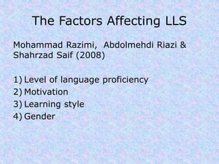 Five factors that affect language learning strategies are discussed: motivation, gender, language proficiency level, learning style, and family background. Motivation is identified as the most important factor by several sources, with more motivated learners using strategies more frequently. Gender differences are also discussed, with females generally using strategies more than males. Language proficiency level influences strategy use, with more advanced learners employing cognitive and metacognitive strategies. Learning style preferences determine what strategies learners adopt, such as social strategies for group-oriented learners. Family background characteristics like socioeconomic status and parental education levels can impact students' language achievement.