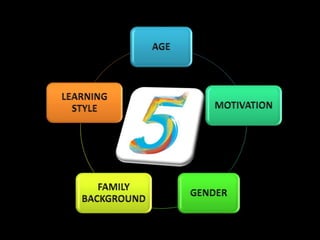 This document discusses several factors that affect language learning strategies, including age, motivation, gender, family background, and learning styles. Younger or less advanced language learners tend to use social strategies more, while motivation is one of the most important factors impacting achievement. Some studies have found that males use strategies more than females, though findings are mixed. Children from larger families may have fewer learning resources. Learning styles also influence the types of strategies students choose, and effective learners use a variety tailored to their personality and goals.
