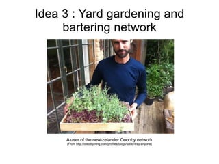 The document proposes five ideas for sustainable living in 2012. Idea 1 is for individual aquaponic home gardens that grow vegetables and fish in the kitchen to provide organic food and save money. Idea 2 is a mobile app connecting users to facilities and community events in their neighborhood. Idea 3 encourages yard gardening and creating a local network for bartering fruits and vegetables. Idea 4 involves developing local exchange trading systems where people can barter skills and possessions. Idea 5 is creating biodegradable clothing that can be composted when no longer worn to protect the environment.