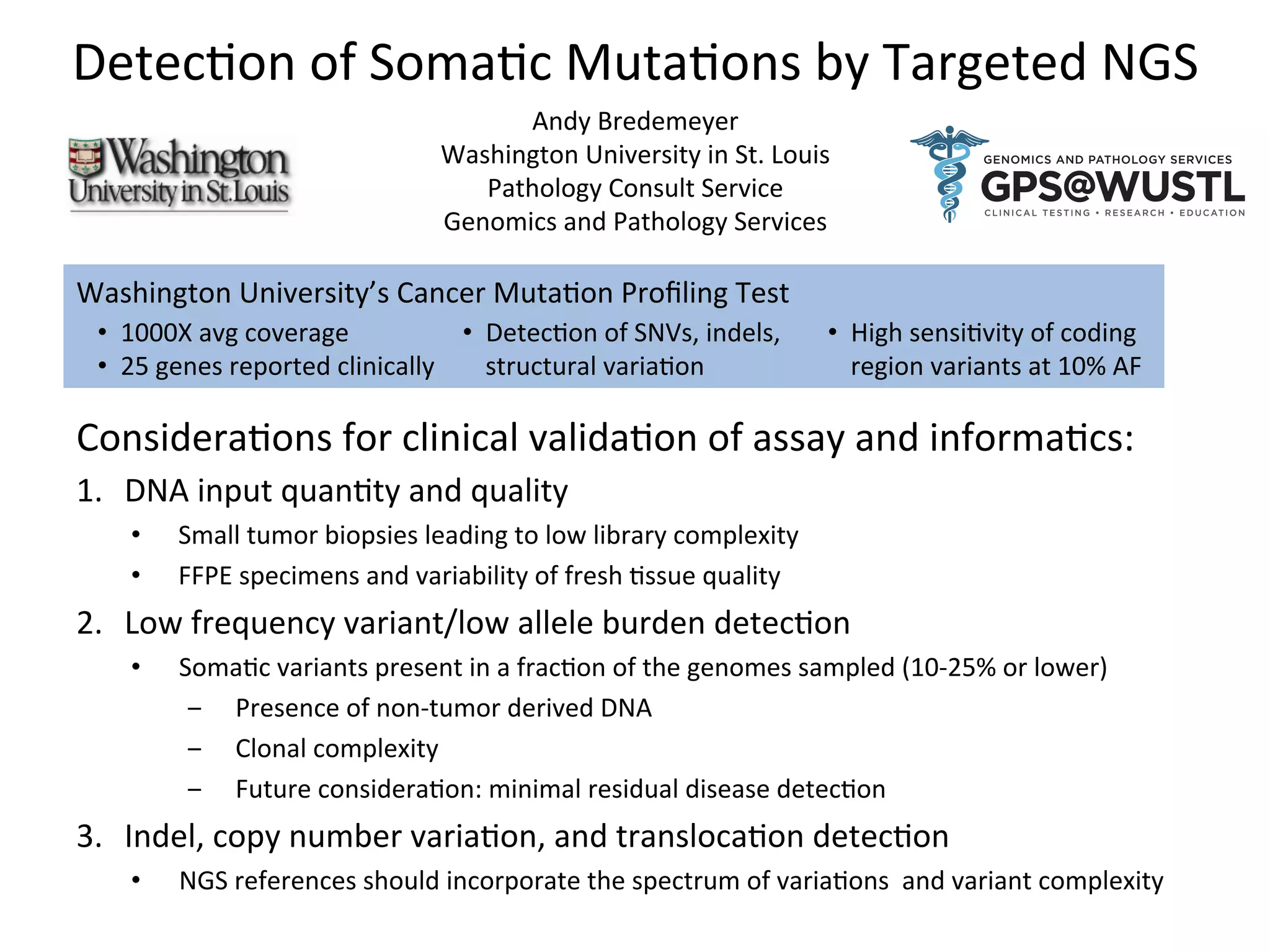 The document discusses Washington University's cancer mutation profiling test, which uses next-generation sequencing (NGS) to detect somatic mutations including single nucleotide variants (SNVs), insertions/deletions (indels), and structural variation. The test provides 1000x average coverage across 25 clinically reported genes and can detect variants present at 10% allele frequency. Considerations for clinical validation of the assay include DNA input quality and quantity from small biopsies or FFPE samples, as well as detection of low frequency variants due to tumor heterogeneity or presence of non-tumor DNA. Validation also requires accounting for detection of indels, copy number variation, and translocations across different NGS platforms and references.