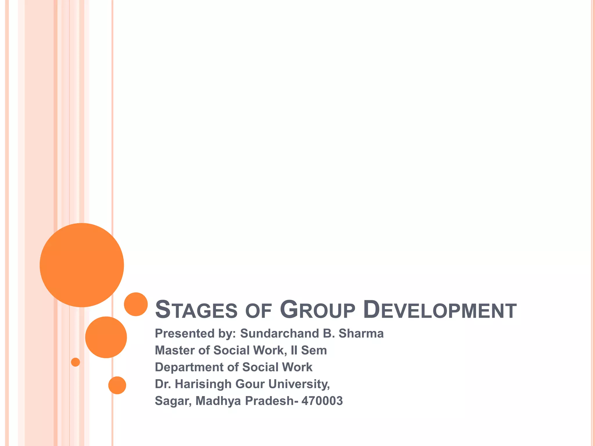 The document discusses the stages of group development based on Bruce Tuckman's model, which includes five phases: forming, storming, norming, performing, and adjourning. It highlights the characteristics and dynamics of each stage, from initial dependence and conflict to cohesion and productivity, leading to a sense of closure. The importance of group interactions and the sociological perspectives on group identity are also emphasized.